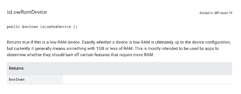 }https://developer.android.com/reference/android/app/ActivityManager#isLowRamDevice()